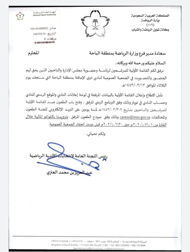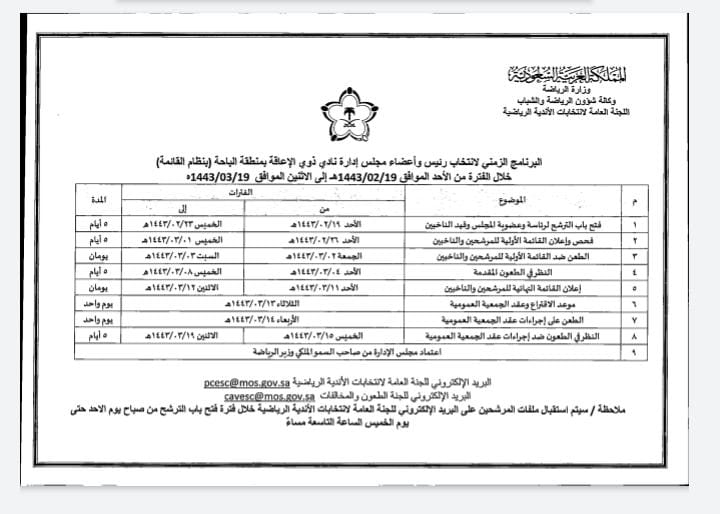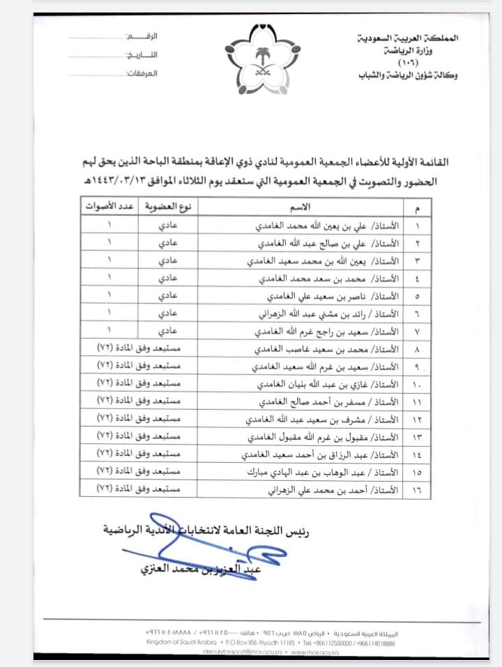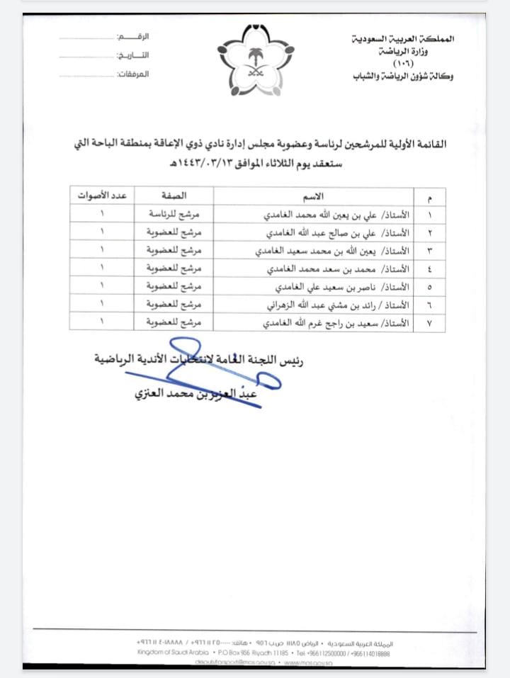 بيان بالقائمة الاوليه للمرشحين لرئاسة النادي والناخبين الذين يحق لهم للحضور والتصويت بالجمعية العموميه التي ستعقد يوم الثلاثاء 13/3/1443 للهجره